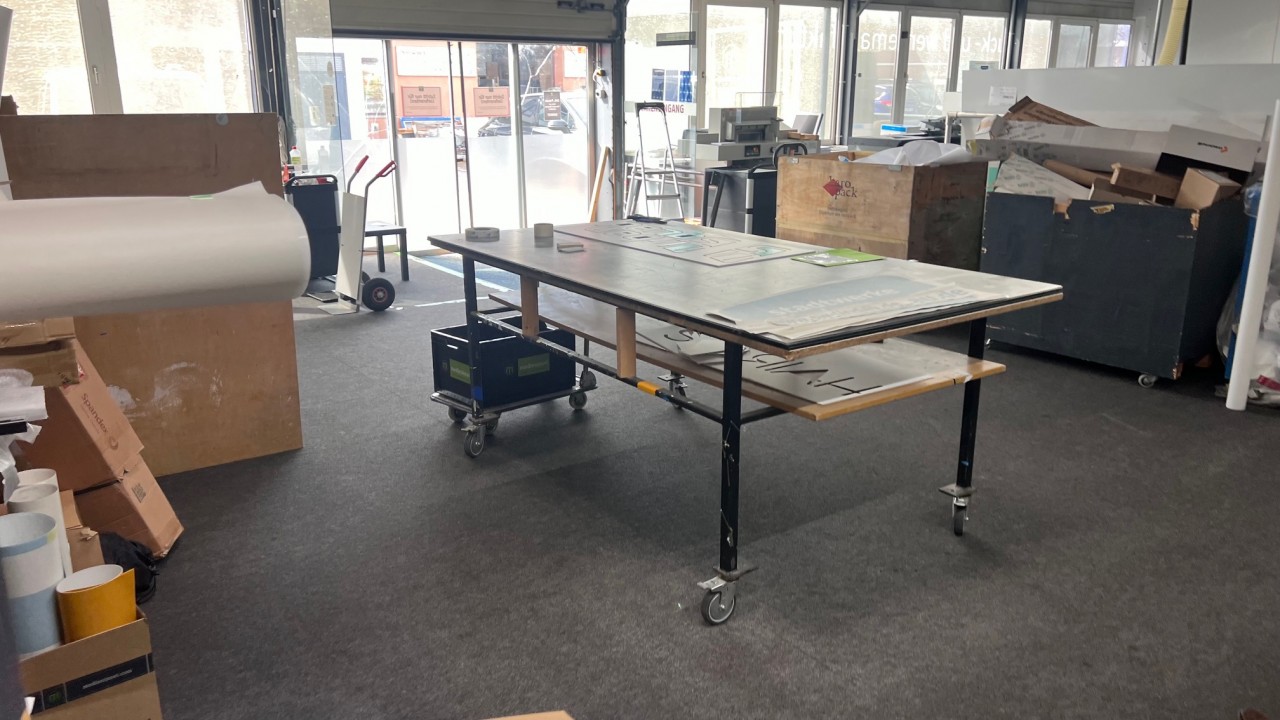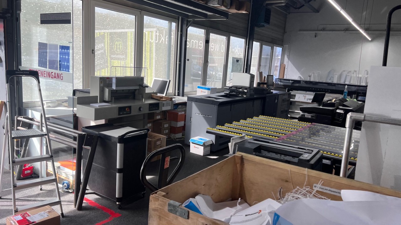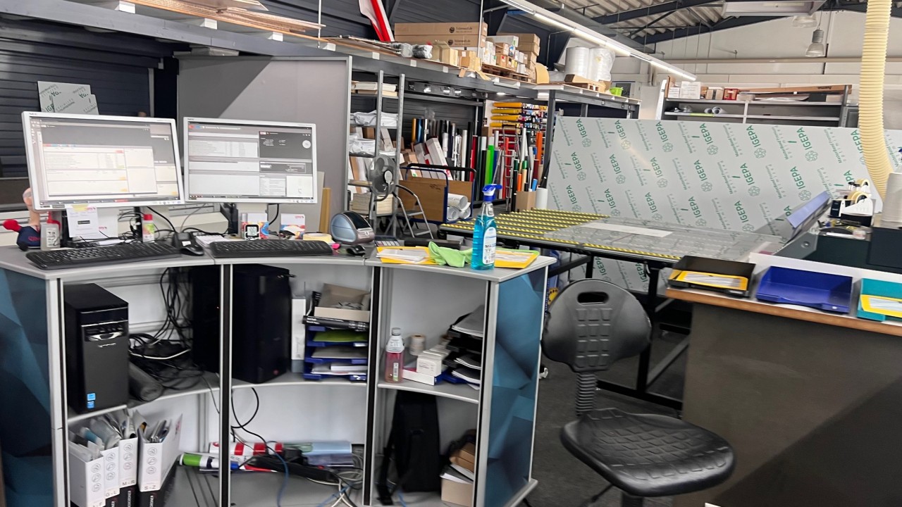 Zum Verkauf kommt die gesamte Betriebs- und Geschäftsausstattung des Unternehmens wie z.B. Fräs-, Schneid- und Bohrmaschine, Fabr. Bullmer, Typ Premium Cut 163, BJ 2018, UV-Gel-Digitaldrucker, von Rolle zu Rolle, Fabr. Canon, Typ Colorado 1640 mit UV-Trocknung, BJ ca. 2018, Konfektionstisch mit Beleuchtung, Fabr. Rolls. Roller AB Schwede, Typ Rolls Roller 400/170R Regular, Tischlänge 4.000 mm, Tischbreite 1.700 mm, BJ ca. 2021, Plotter, Fabr. Summa, Typ Class T-Series 120, BU ca. 2018, Büroeinrichtung, Fahrzeuge etc.